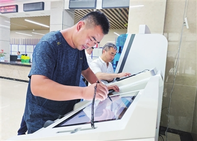 7月27日,在縣社保服務(wù)大廳,市民在IMT自助終端設(shè)備上辦理業(yè)務(wù)。今年,我縣完成“社保服務(wù)事項(xiàng)進(jìn)銀行”試運(yùn)行和全面推廣工作,努力實(shí)現(xiàn)服務(wù)事項(xiàng)“就近辦、便捷辦、快速辦”目標(biāo)。