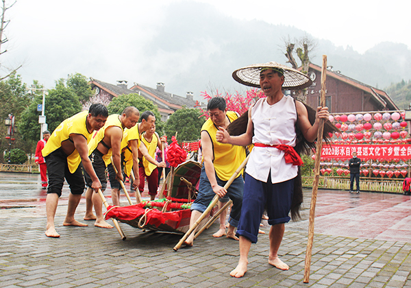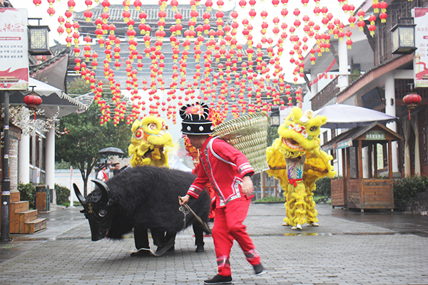 活動現場,一時鑼鼓喧天,只見一名表演者牽牛、兩名表演者玩牛,兩個人將栩栩如生的黑牛道具披在身上,在牽牛人的逗弄下,時而發怒、時而撒歡、時而老實;舞動的“雄獅”雙眼靈動,外形俊俏,大嘴張合有度,時而搖頭擺尾、昂首仰視,時而俯身匍匐,舞姿妙趣橫生;游動的“巨龍”也毫不遜色,蛟龍漫游、蛻皮、鉆節、追珠,一個個經典動作被舞龍者展現得淋漓盡致。期間,吹嗩吶、玩牛、烏江號子等傳統藝術表演博得現場觀眾拍手叫絕。