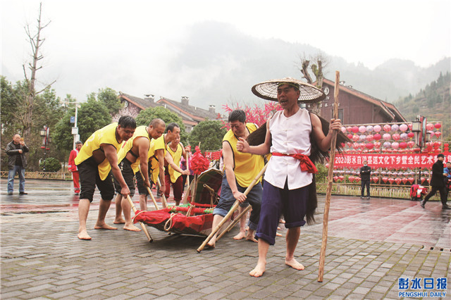 活動(dòng)現(xiàn)場(chǎng),一時(shí)鑼鼓喧天,只見(jiàn)兩人將栩栩如生的黑牛道具披在身上,在牽牛人的逗弄下,時(shí)而發(fā)怒、時(shí)而撒歡、時(shí)而老實(shí),動(dòng)作喜劇夸張,讓人忍俊不禁;舞動(dòng)的“雄獅”雙眼靈動(dòng),外形俊俏,大嘴張合有度,時(shí)而搖頭擺尾、昂首仰視,時(shí)而俯身匍匐,舞姿妙趣橫生;游動(dòng)的“巨龍”也毫不遜色,蛟龍漫游、蛻皮、鉆節(jié)、追珠,一個(gè)個(gè)經(jīng)典動(dòng)作被舞龍者展現(xiàn)得淋漓盡致。期間,吹嗩吶、玩牛、烏江號(hào)子等傳統(tǒng)藝術(shù)表演博得現(xiàn)場(chǎng)觀眾拍手叫絕。