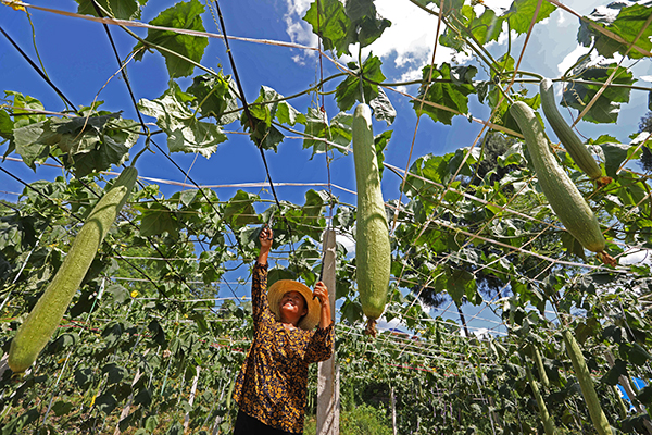 重慶彭水網(融媒體記者 廖 唯 攝影)7月5日,桐樓鄉細沙村絲瓜種植基地,村民們正在對絲瓜疏果、剪枝、剪花、加固等管護,確保絲瓜豐收。桐樓鄉在鞏固拓展脫貧攻堅成果同鄉村振興有效銜接中,全力構建“一村一品”產業發展格局。其中,細沙村通過流轉土地,以“公司+村集體經濟+農戶”的模式發展種植200畝絲瓜,以銷售絲瓜絡產品為主,年產值實現90多萬元,帶動100余戶村民增收。據了解,絲瓜絡市場前景廣闊,其密度高、硬度高,是生產床墊、鞋墊、坐墊、洗浴用品的主要原材。