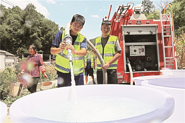桑柘鎮組織干部職工,用消防車為缺水的村莊送水到家門口。趙 勇 攝影