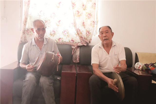 “正月是新年,牛郎進花園……”8月18日,在平安鎮平安社區,苗山打鬧非遺傳承人唐守學手拿鼓槌敲擊著小鼓,唐守貴拿著鑼槌敲擊著鑼,二人相互配合演唱了一段苗山打鬧《九連環》。