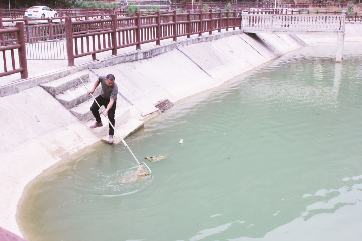 魚塘負責(zé)人在打撈漂浮物。