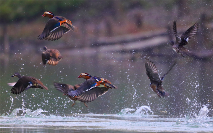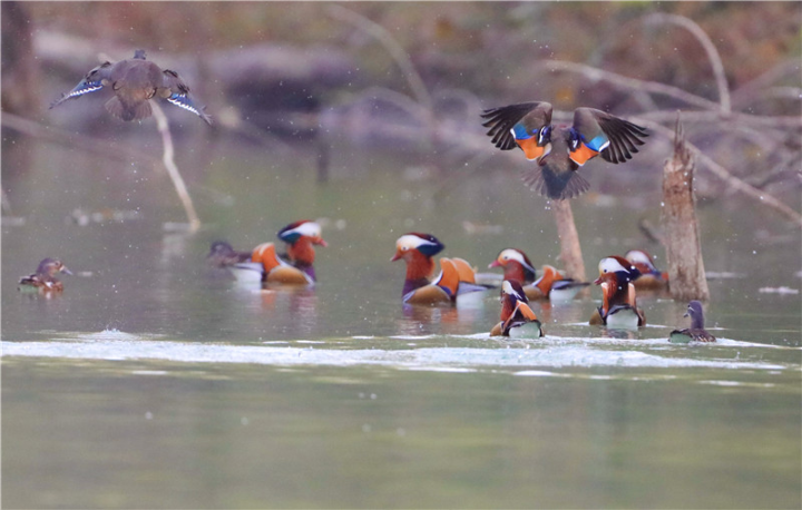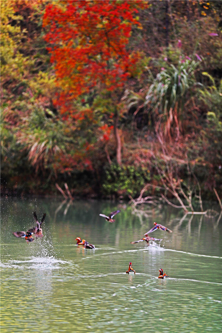 11月9日,在彭水諸佛江鹿角段的江面上,一群國(guó)家二級(jí)保護(hù)動(dòng)物鴛鴦?wù)谒嬉捠场蛩嗖实挠鹈c青山碧水相映成趣,構(gòu)成一幅幅美麗的生態(tài)畫卷。