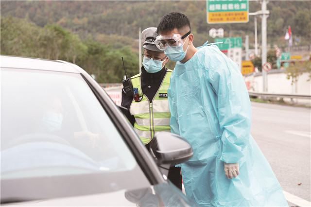 工作人員正在高速路口堅守崗位查驗過往車輛駕乘人員的健康碼、行程碼。融媒體記者 鐘 建 攝影