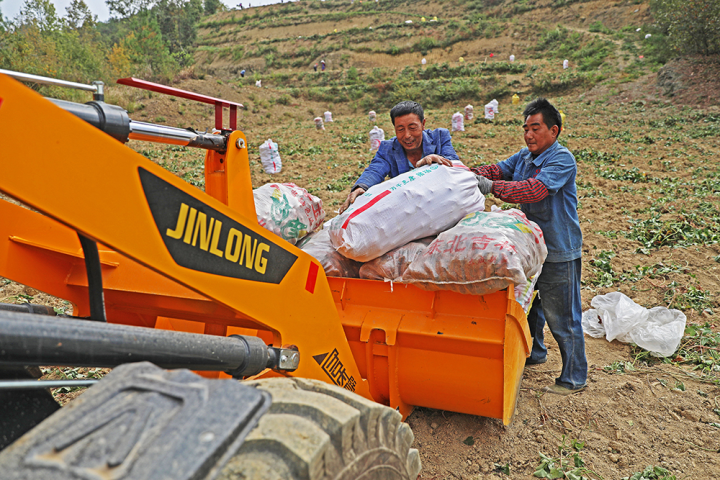 在郁山鎮(zhèn)鐘鼓村紅薯種植基地,土地宜機化整治后,村民用鏟車到紅薯基地轉(zhuǎn)運紅薯,減少人力成本。