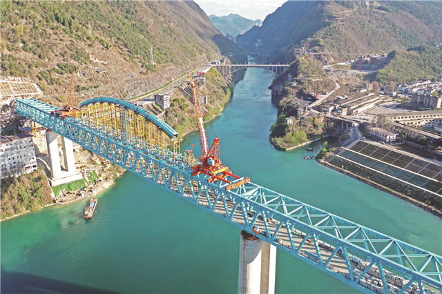 重慶彭水網(wǎng)(作 者:趙 勇)3月13日,工人們正在加快渝湘高鐵清水坪烏江大橋的鋼拱肋架設(shè)。