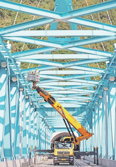 同樣,在渝湘高鐵清水坪烏江大橋建設(shè)現(xiàn)場(chǎng),工人們正在忙著進(jìn)行橋梁第二道面漆涂裝。據(jù)了解,由中鐵大橋局承建的渝湘高鐵清水坪烏江大橋建設(shè)項(xiàng)目進(jìn)入收尾階段,主體結(jié)構(gòu)已施工完成,工人們正在加快橋面附屬工程建設(shè)及二道面漆涂裝,為下一階段的鋪軌施工奠定基礎(chǔ)。