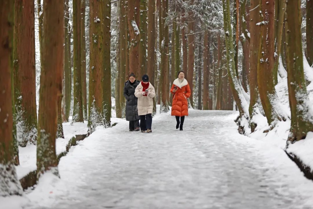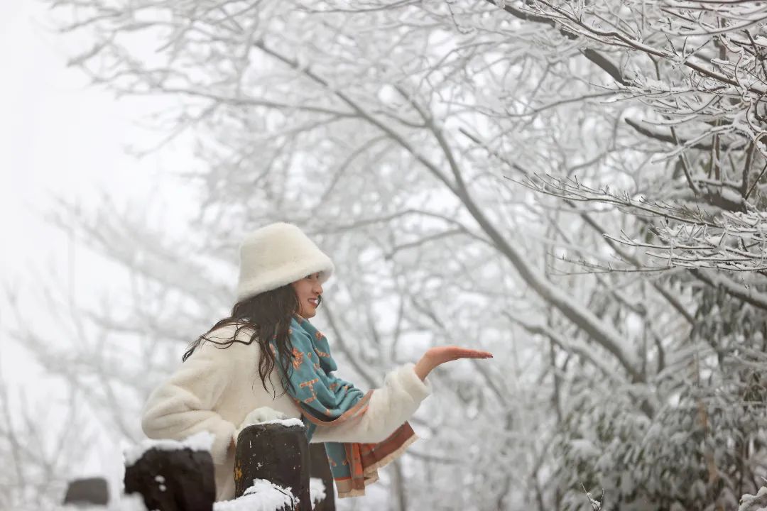 2025年1月8日,隨著近日氣溫持續走低,彭水高海拔地區下起了今年第一場瑞雪,到處一片銀裝素裹,蒼茫山景瞬間就化作冰雪世界。圖為游客正在摩圍山景區游玩。